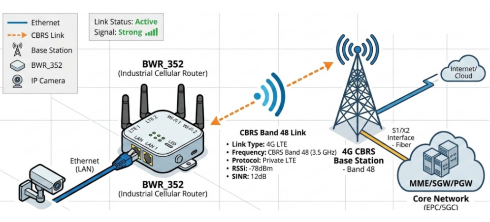 In the US, BWR_352 with a CBRS-capable 4G module connects to your own private base station on the free Band 48 spectrum — ideal for campus-wide smart surveillance without carrier fees.